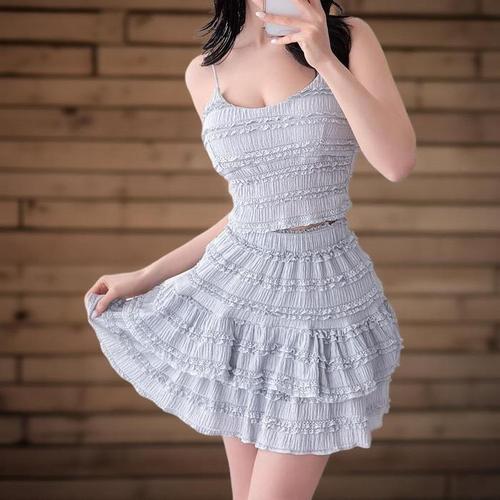 [신상오픈런]여성 프릴 디자인 민소매 티셔츠와 캉캉 미니스커트 세트 (33713226)
