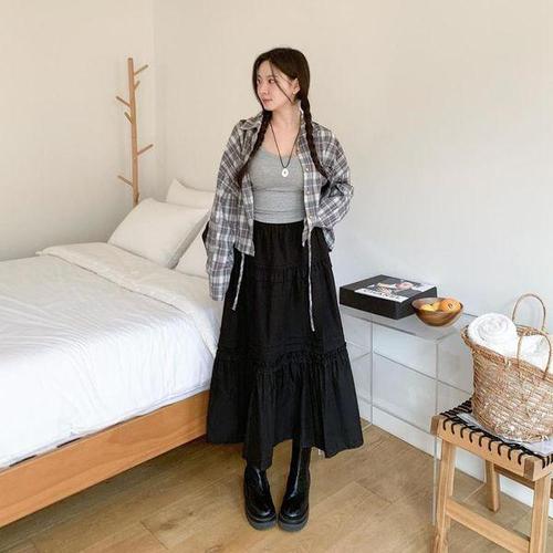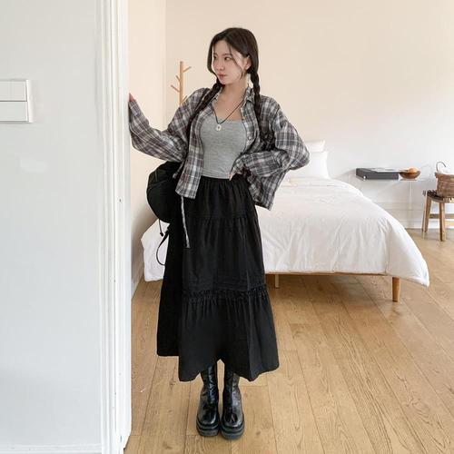 [옷자락]여자 데일리룩 플레어 캉캉 맥시 롱스커트
