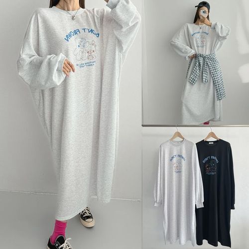 [문에이블]문에이블 라운드넥 캐릭터 프린트 데일리 편안한 옆트임 롱 원피스