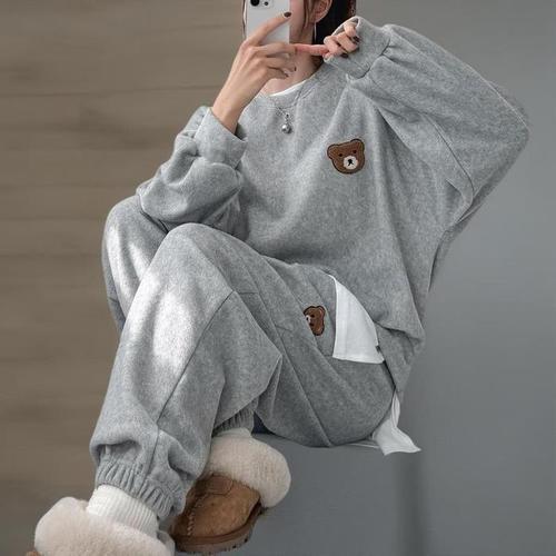 [신상오픈런]여성용 곰 캐릭터 나그랑 후리스 맨투맨과 조거팬츠 세트 (42636455)