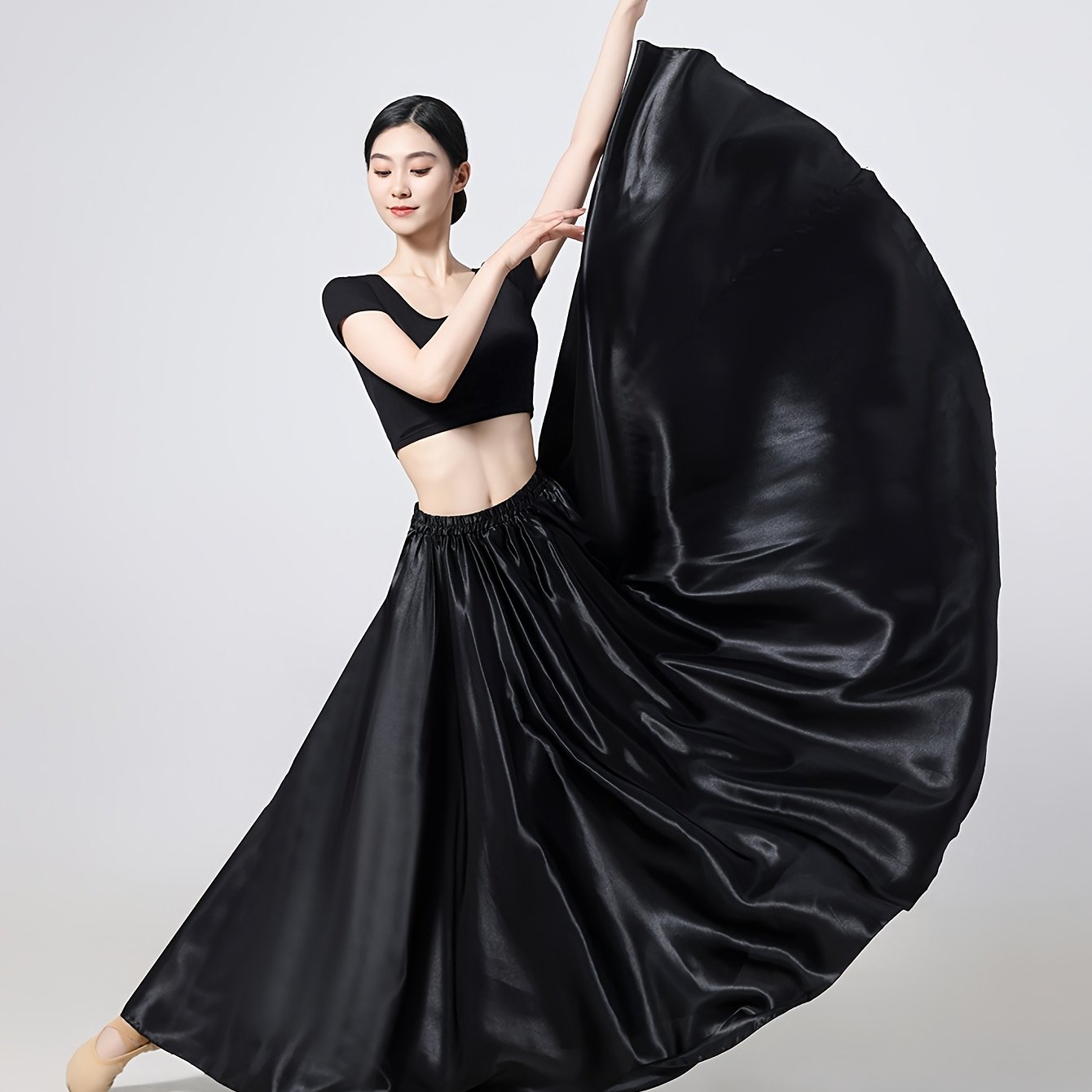 TEMU 우아한 95cm 새틴 롱 미디 스커트 | 탄성 허리, 360° 댄스 스커트 (공주 역할극용), 단색, 루즈핏