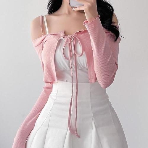 [다잇템][다잇템] 여성 바스트 어깨끈 골지 잔주름 민소매티 카디건 캡 세트_20495867_588872