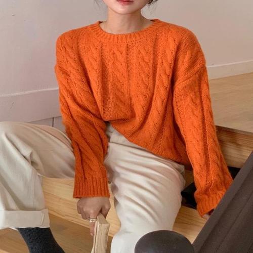 [신상오픈런]여성 심플 컬러 꽈배기 디자인 반목 루즈핏 긴팔 니트 (41928295)