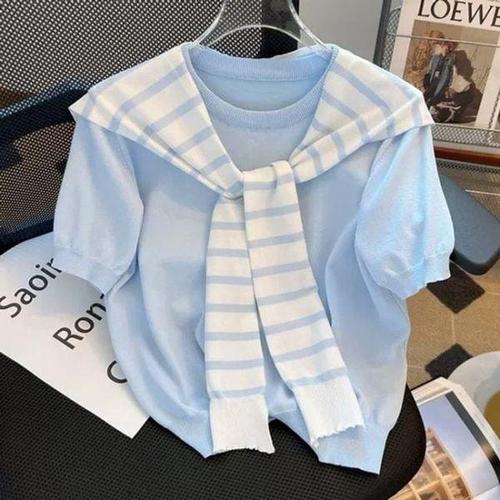 [에이치플러스몰]머스트해브 케이프 레이디스 세로줄 썸머 숏슬리브울탑 코디세트