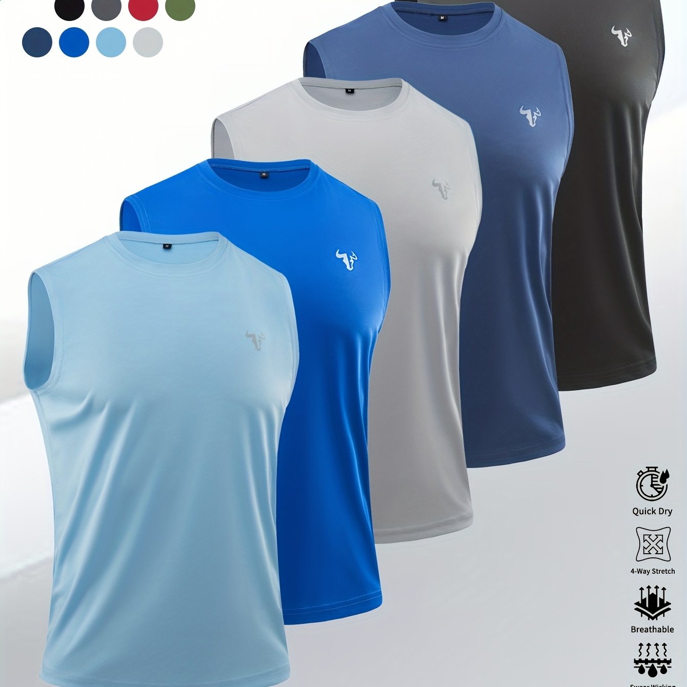 TEMU 와웰 남성용 솔리드 컬러 & 황소머리 프린트 민소매 티셔츠 5팩 - 빠른 건조 통기성 운동복, 헬스, 러닝, 농구, 야외 트레이닝용 - 팀용 대량 패키지 (5개) - 세탁기 사용 가능