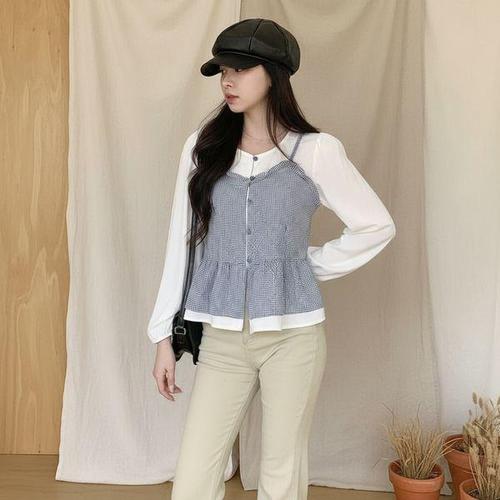 여자 격자 코디 폴리 페플럼 코르셋 블라우스
