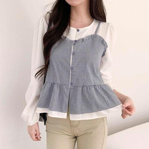 [다잇템]여성 페플럼 코르셋 폴리 격자 코디 블라우스