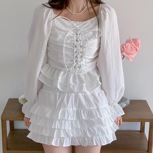 여자 잔주름 귀여운 코르셋 프릴 블라우스