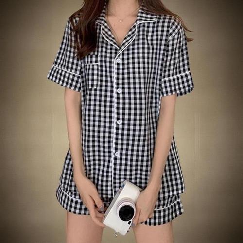 [신상오픈런]여성용 쿨링 체크 잠옷 세트 반팔 티셔츠와 반바지 (38642314)