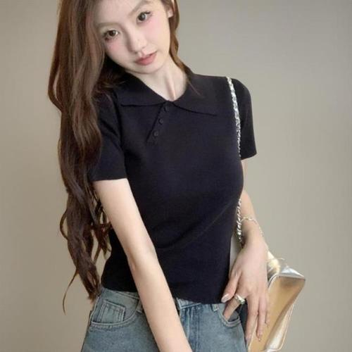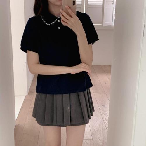 [신상오픈런]여성 단색 면 스트라이프 핀턱 카라 반팔 티셔츠 (33139160)