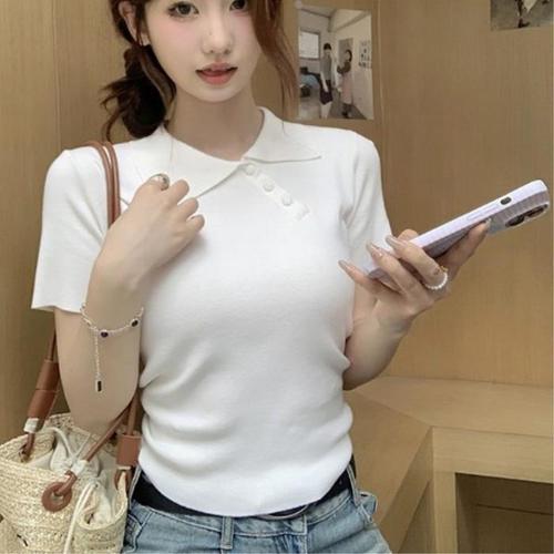 [신상오픈런]여성 슬림핏 언발란스 카라넥 반팔 면혼합 티셔츠 (39101670)