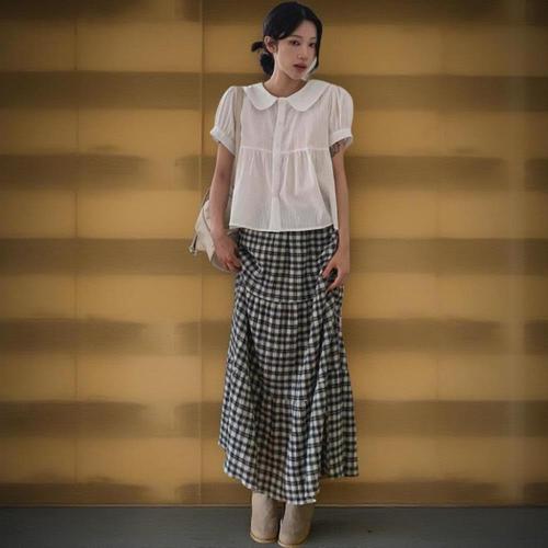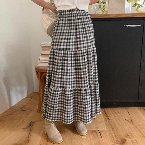 |KHK15B0|여성 캐주얼 코튼 체크 플레어 롱 스커트 핀턱 셔링
