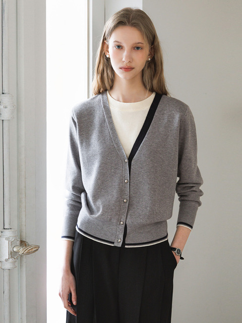 [쥬아르] 클래식 배색 니트 레이어드 콩단추 V넥 가디건_4color