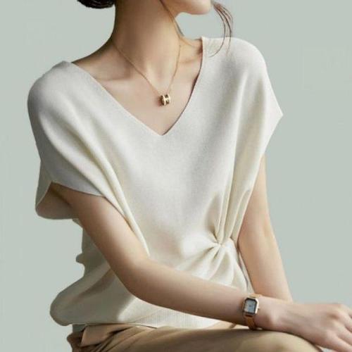 [에이치플러스몰]여름 인기 여성 브이넥 쿨 감성 반팔 니트 티 셔츠