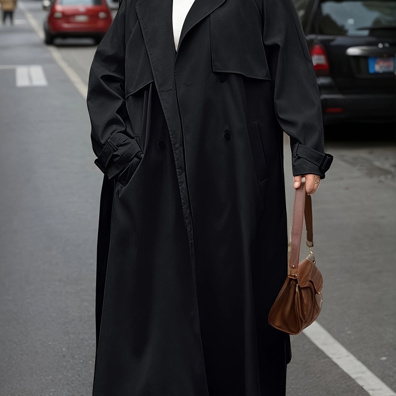 TEMU 남성 우아한 더블 브레스트 트렌치 코트 - 긴 소매, 버튼 업, 단색 블랙, 캐주얼 아웃팅 및 파티에 완벽, 봄/가을 착용, 세련된 라펠 칼라, 내구성 있는 원단