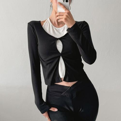 [옷자락]여자 레이어드 꼬임 트임 홀터넥나시 크롭 긴팔 티셔츠