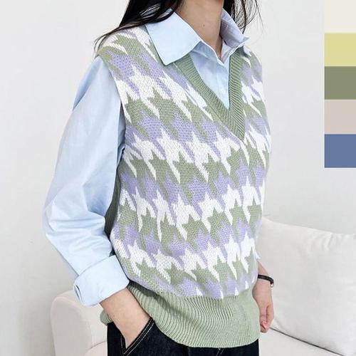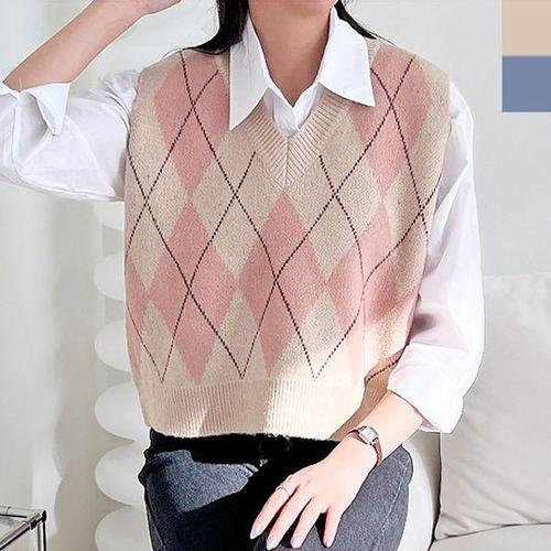 [에이치플러스몰]여성 아가일 브이 세미크롭 니트 베스트 1P 조끼 코디