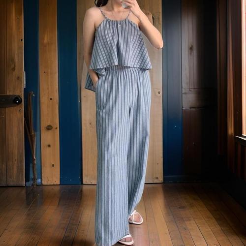 [신상오픈런]여성 해변용 스트라이프 비대칭 크롭탑 와이드팬츠 세트 (33139082)