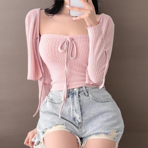 [신상오픈런]여성 홀터넥 크롭탑 라운드넥 슬림핏 긴팔 가디건 세트 (40946761)