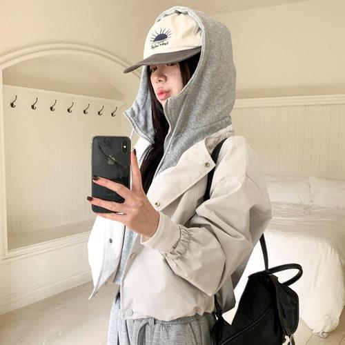 [옷자락] 여성 간절기 후드 레이어드 크롭 점퍼 블루종