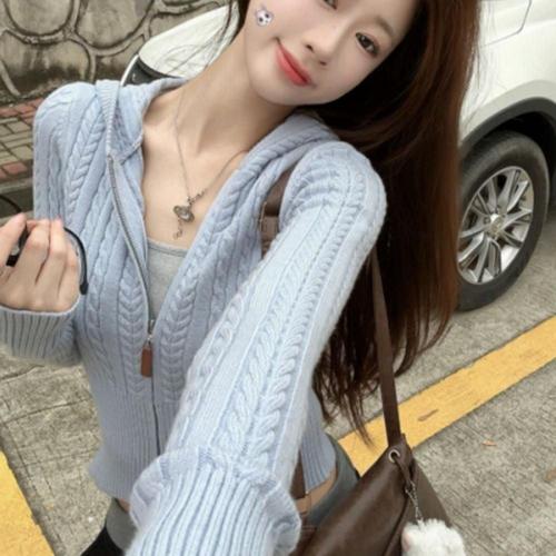 여성 슬림핏 크롭 케이블 꽈배기 니트 후드 자켓 집업 WFL6XZ1