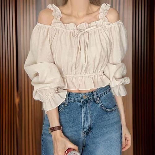 [신상오픈런]프릴블라우스 공주풍 중세 긴팔 크롭 스퀘어넥 올셔링 (31926343)