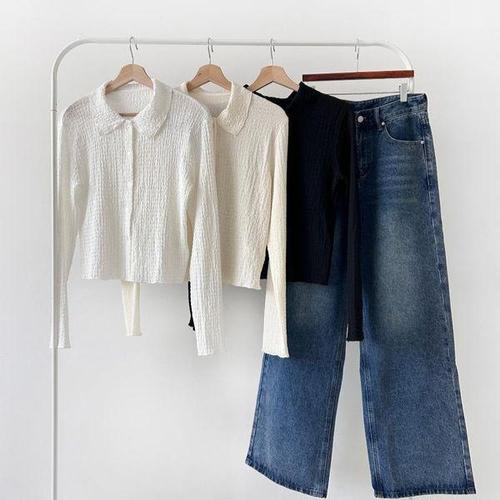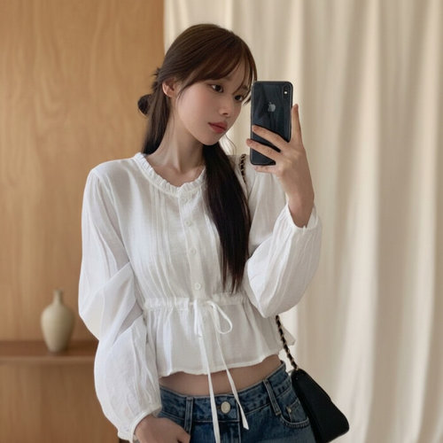 [옷자락]여자 라운드 카라 엠보 크롭 긴팔 셔츠 블라우스