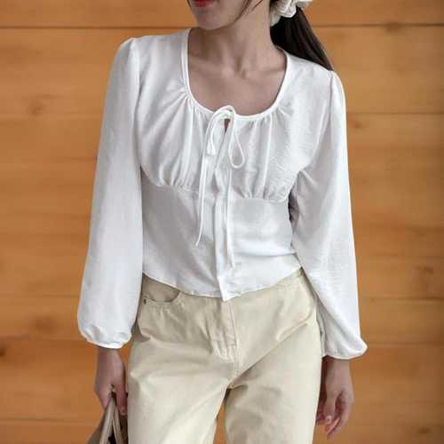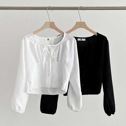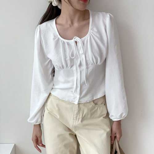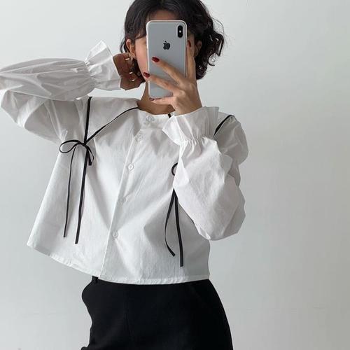 옷자락 / 여자 가을 리본 유넥 셔링 퍼프긴팔 크롭 블라우스