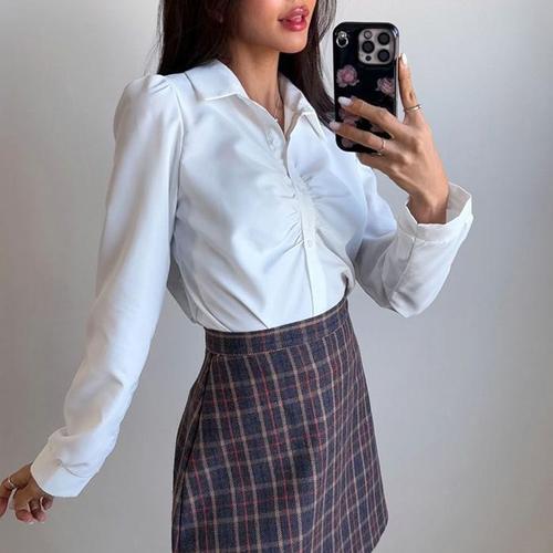 [신상오픈런]셔링블라우스 긴팔 크롭 흰남방 슬림핏셔츠 (30416888)
