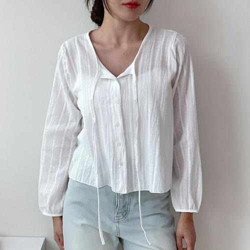 옷자락 / 여자 리본넥 꽈배기 시스루 크롭 긴팔 코튼 블라우스