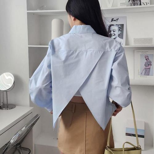 [신상오픈런]백리스 랩셔츠 크롭 하늘색 긴팔 무지 여성면남방 (32054694)