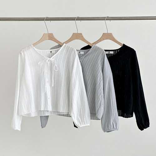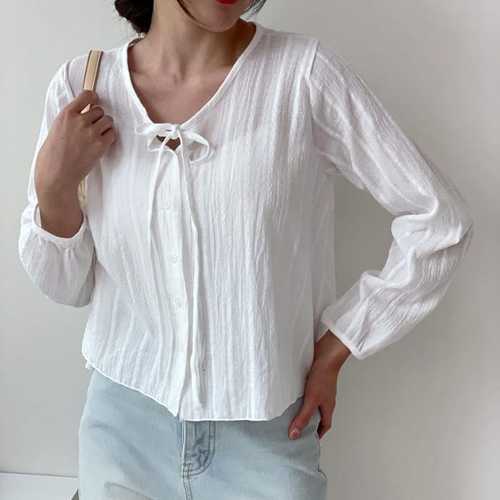 [신상오픈런]여성 리본 목걸이 꽈배기 시스루 크롭 긴팔 면 블라우스 (40818148)