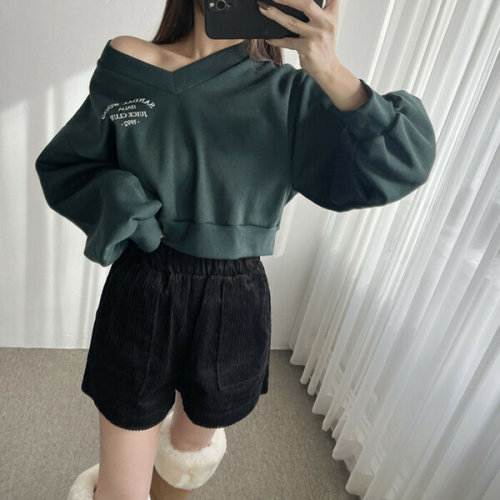 여성 트렌디 오프숄더 브이넥 루즈 크롭 맨투맨