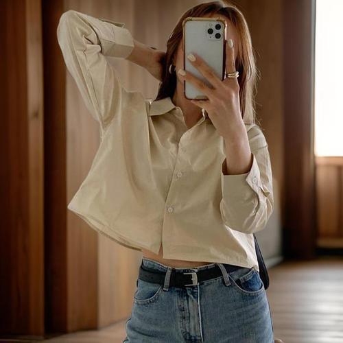 [신상오픈런]크롭셔츠 무지 코튼 키작녀 미색 봄남방 긴팔 (31545781)
