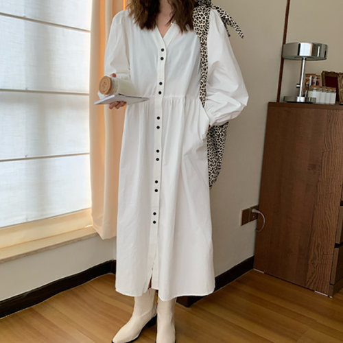 슈팅스타 / 브이넥 단추 셔츠형 롱 원피스