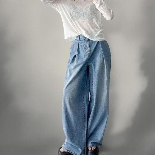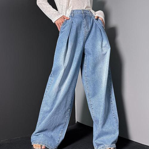 [신상오픈런]여성 핀턱 루즈핏 와이드 청바지 키 큰 사이즈 워싱 연청색