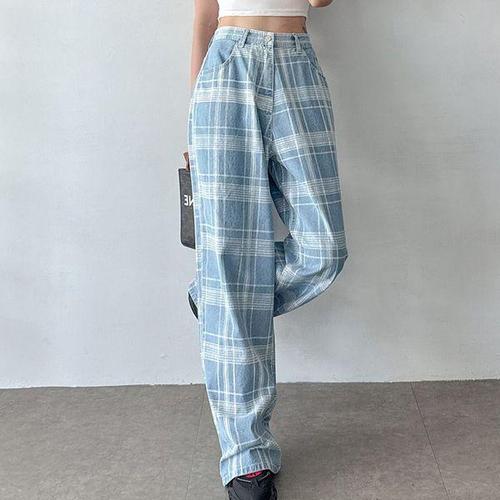 [옷자락]여자 Y2K 여름 체크팬츠 키큰녀 루즈 와이드핏 청바지