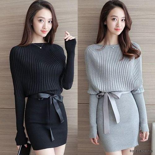 [에이치플러스몰]데일리타이트핏 세미플레어 유니크 프렌치 뜨개탑 원피스룩