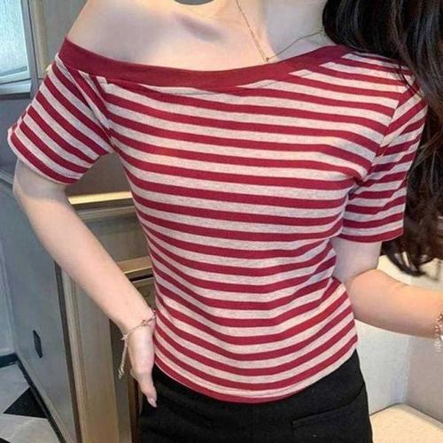 [에이치플러스몰]가로줄데일리 원숄더 타이트 반소매 숏기장티