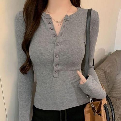 지고다그 여성용 봄가을용 반폴라 니트 블라우스 버튼포인트 슬림핏 데일리 니트티 YY32786