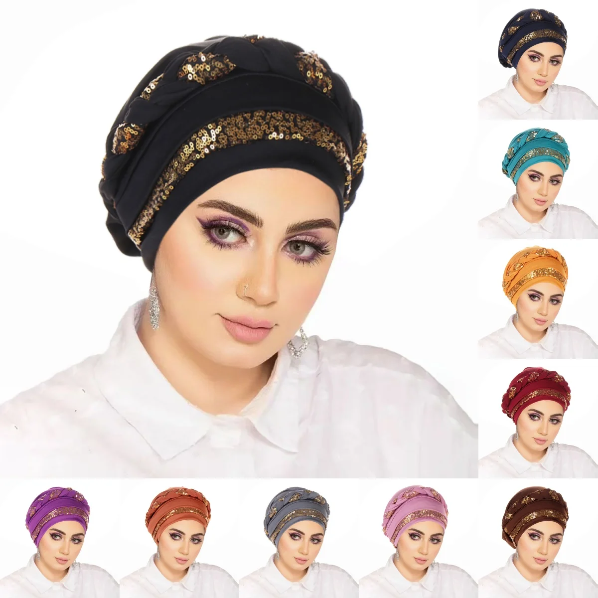 여성 히잡 터번 모자 스팽글 단색 브레이드 트위스트 캡 암 화학요법 비니 모자 헤드랩 플레이트 탈모 커버