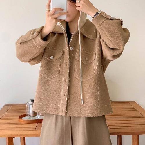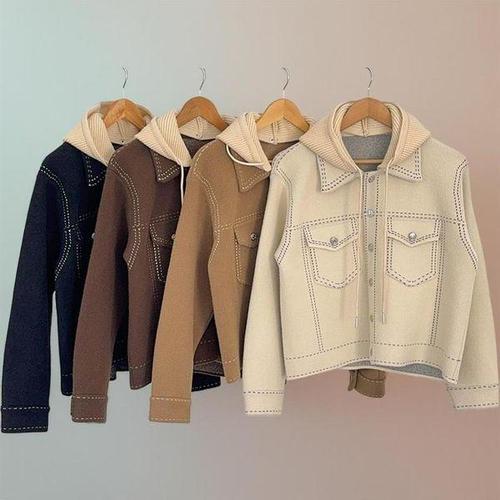 [신상오픈런]여자 스티치 니트 카라넥 탈부착후드 포켓 투웨이 자켓