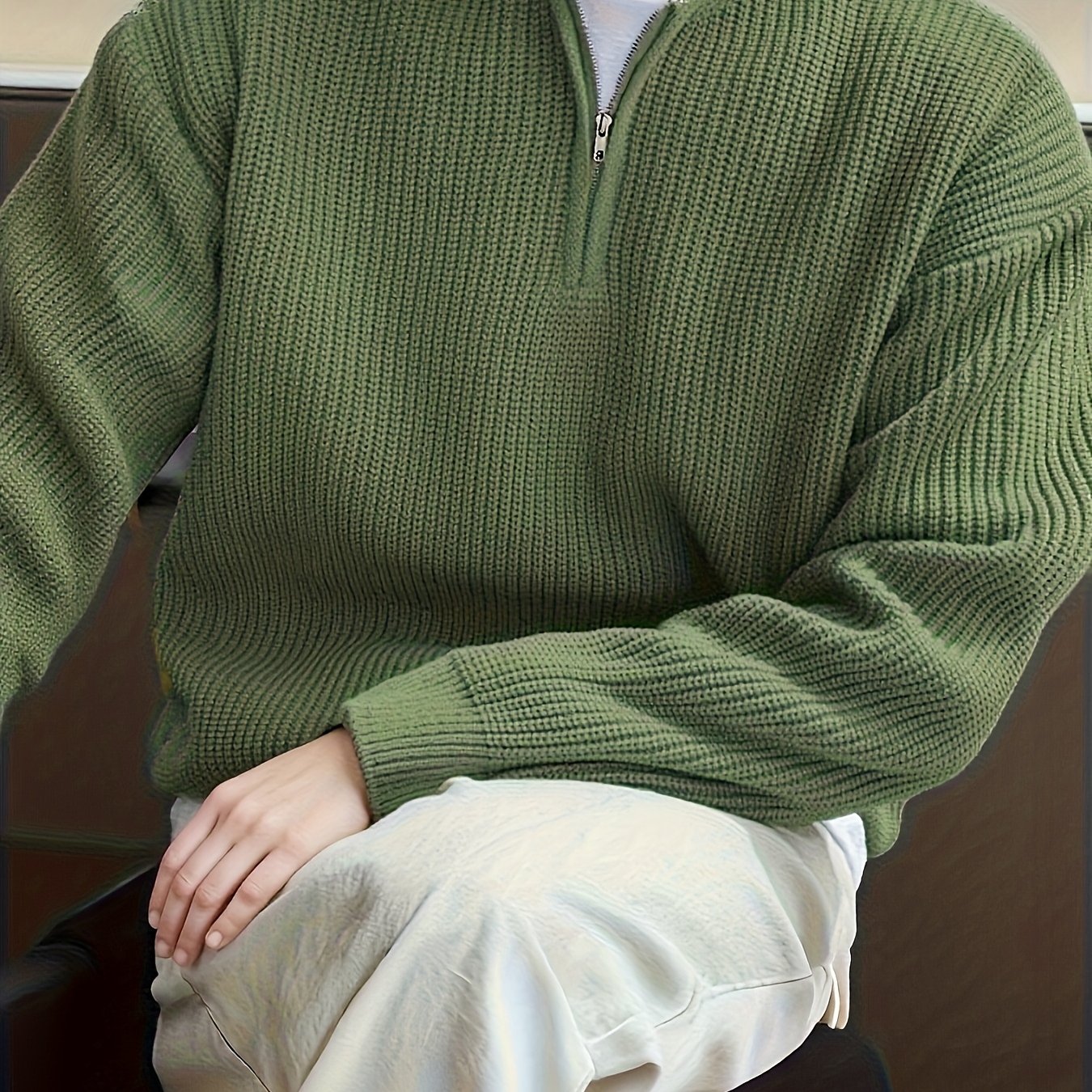 TEMU 남성 패션 V넥 지퍼 디자인 솔리드 컬러 스웨터 드롭 숄더 니트 가을 겨울 캐주얼 스웨터