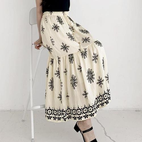 [신상오픈런]여성 보헤미안 태슬 장식 프린트 캉캉 밴딩 린넨 롱스커트 (39079174)