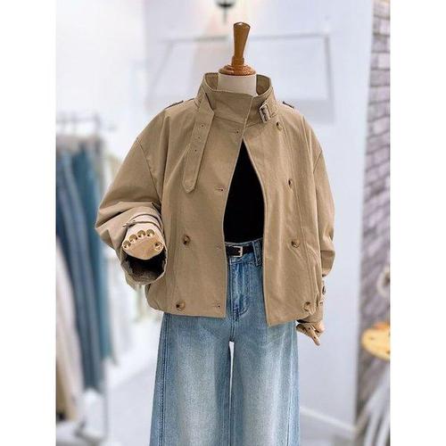 벨트 웨이스트 크롭 트렌치 재킷 여성 더블 브레스티드 스탠드 칼라 코트 2025 가을 시크 캐주얼 빈티지 재킷 여성 의류