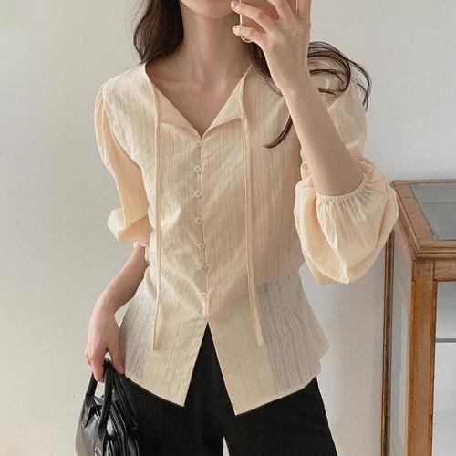 [모어렌][모어렌] [MADE] 트리안 리본 버튼 라운드 블라우스[tbs0447]