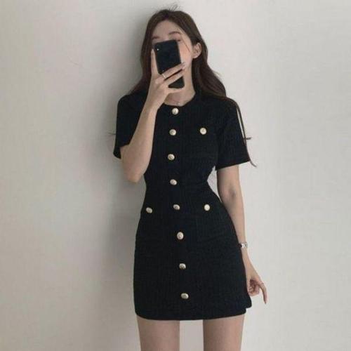 [에이치플러스몰]버튼 반팔 캐주얼 원피스 라인 필수템 미니 트위드 하