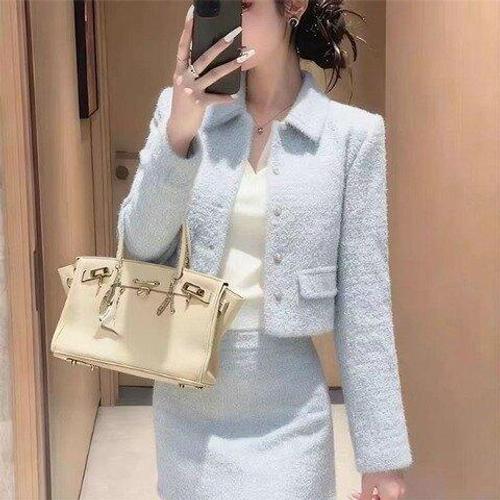 캐주얼 여성 하객룩 세트 봄 가을 패션 슬림핏 크롭 트위드 자켓 + 미디 스커트 세트 여자 긴팔 자켓 치마 세트 CJJ
