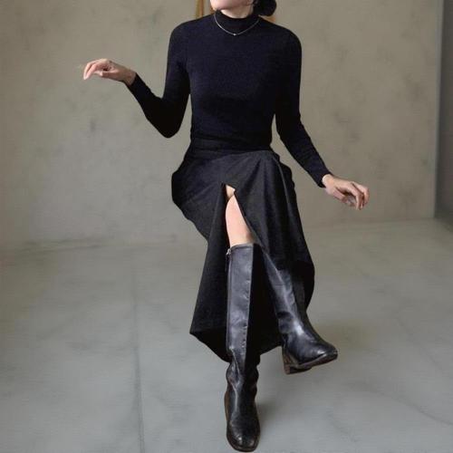 [옷자락]여자 벨벳치마 뒤트임 일자 스티치 블랙 데님 롱스커트
