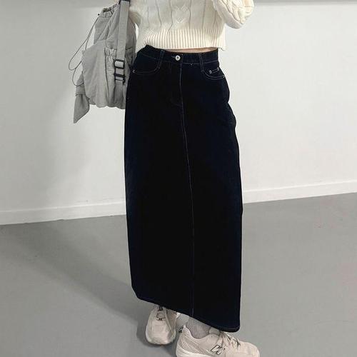 [신상오픈런]여자 벨벳치마 뒤트임 일자 스티치 블랙 데님 롱스커트